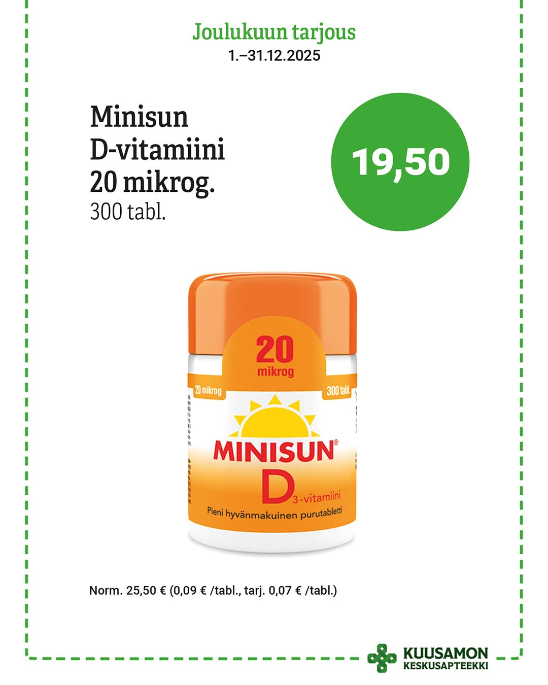 Kuusamon Keskusapteekki tarjoaa erinomaisia tarjouksia muun muassa laadukkaasta kosmetiikasta ja erilaisista itsehoitotuotteista. Lue kuukausittain vaihtuvista apteekkitarjouksistamme ja tule meille ostoksille Kuusamon ydinkeskustassa. Tältä sivulta löydät kätevästi kuukausitarjouksemme. Kysy myös rohkeasti lisätietoja tuotteista – palvelemme mielellämme!